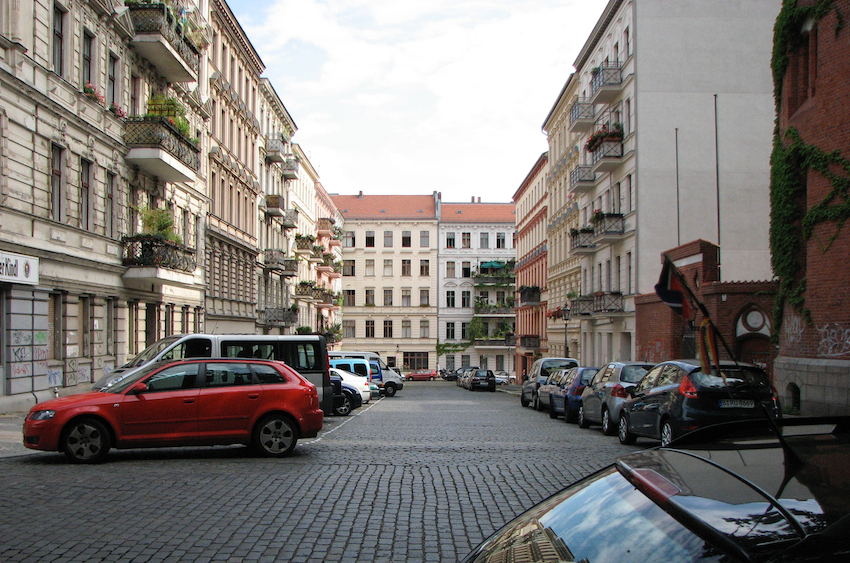 Typical side street in Kreuzberg (south-central Berlin). Our whole neighborhood looked like this. Lots of cars parked, but no traffic on the side streets.