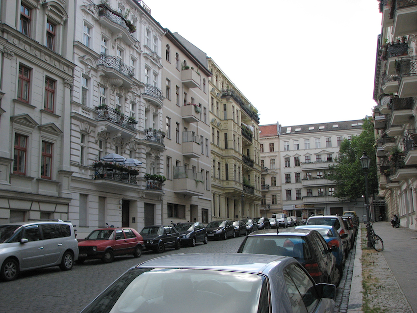 Standing outside our apartment. Our whole neighborhood looked like this. Lots of cars parked, but no traffic on the side streets.